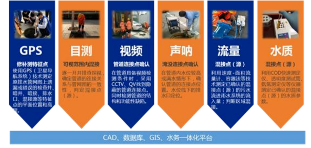 污水收集系統排查是指綜合運用各種儀器設備找出自然水體倒灌、地下水滲入的發生地,查明造成污水系統混流的原因,并系統性提出解決方案以供業主方參考,從源頭上發現污水未收集、外來水進入等異常狀況,進而解決污水處理廠進廠水質異常問題。如下圖所示,該項調查融入測繪、地理信息系統、水質分析、流量監測、視頻檢測等多項技術,公司研發團隊以排水GIS為基礎,使用“開闔法”排查技術體系,通過主動改變水流流向,判斷區域是否存在外來水,查明外來水的流入途徑,并進行定量分析。