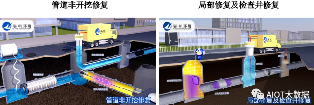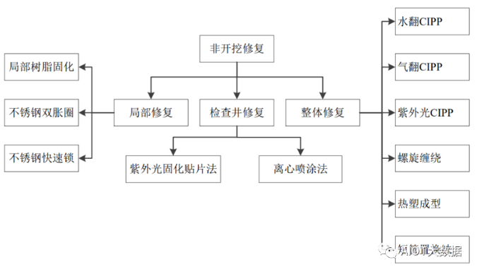 非開挖修復可根據修復的范圍和長度分為整體修復和局部修復兩大類。整體修復針對兩個檢查井之間的一段管道進行修復和更新,修復后的管道可以恢復原有的過水功能。局部修復通常用于處置點狀和環狀等縱向長度小于0.5米的缺陷。